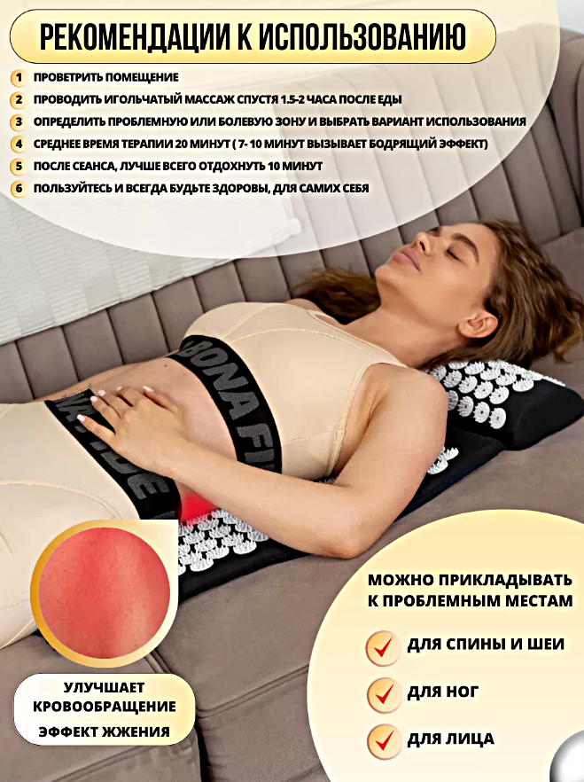 | Отзыв: | Я недавно приобрела себе такой массажный коврик и очень довольна этой покупкой. Коврик имеет множество иголок, которые проникают в кожу и стимулируют кровоток. Это помогает улучшить кровообращение и уменьшить напряжение в мышцах. Коврик легкий и удобный в использовании, его можно использовать как дома, так и на работе. Я рекомендую его всем, кто хочет получить быстрый и эффективный массаж. |