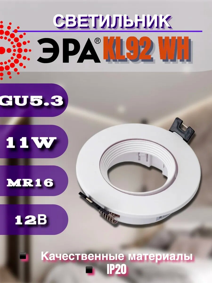 Встраиваемый светильник декоративный ЭРА KL92 WH MR16/GU5.3 белый, пластиковый арт. Б0054373 (1 шт.)