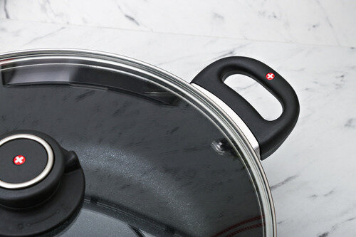 | Плюсы: | Большой объём, красивый дизайн, стеклянная крышка с клапаном, подходит для индукционных плит и использования в духовке. Made in Швейцария! |