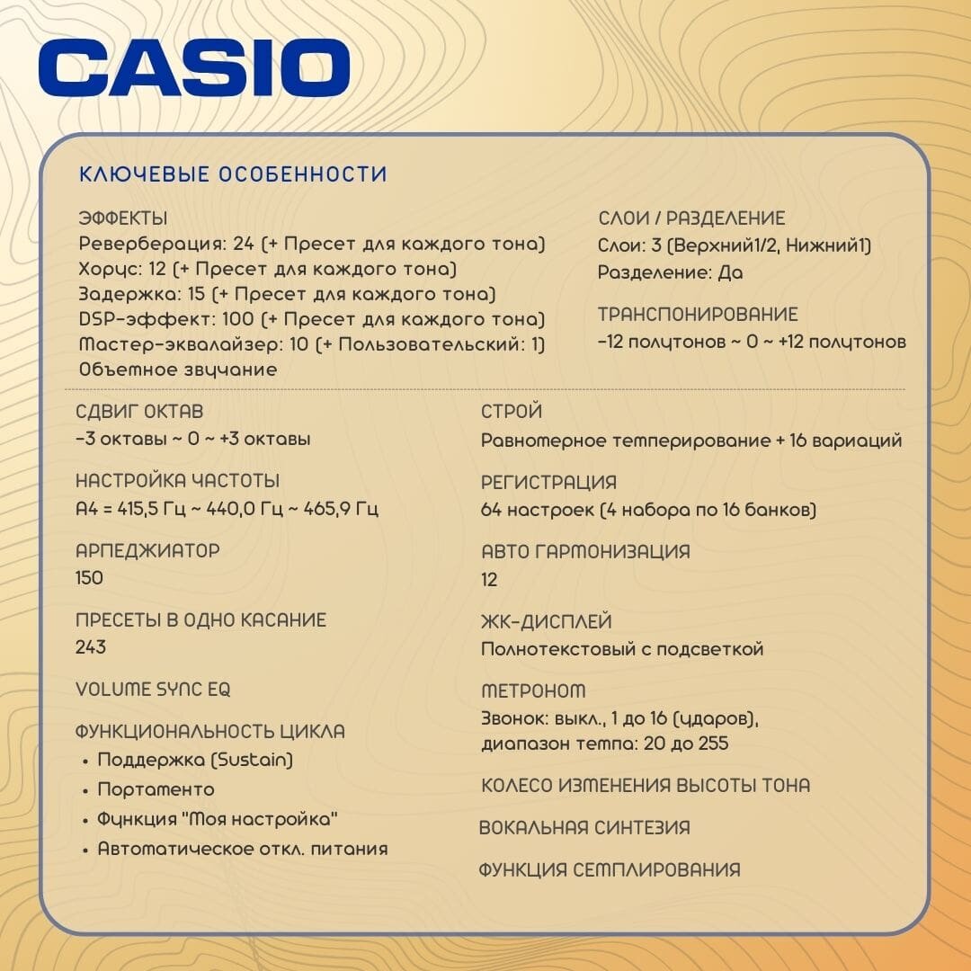 | Функции и опции | автоаккомпанемент / арпеджиатор / вокодер / метроном / обучение / разделение клавиатуры / реверберация / транспонирование / чувствительность клавиатуры к касанию / эквалайзер |