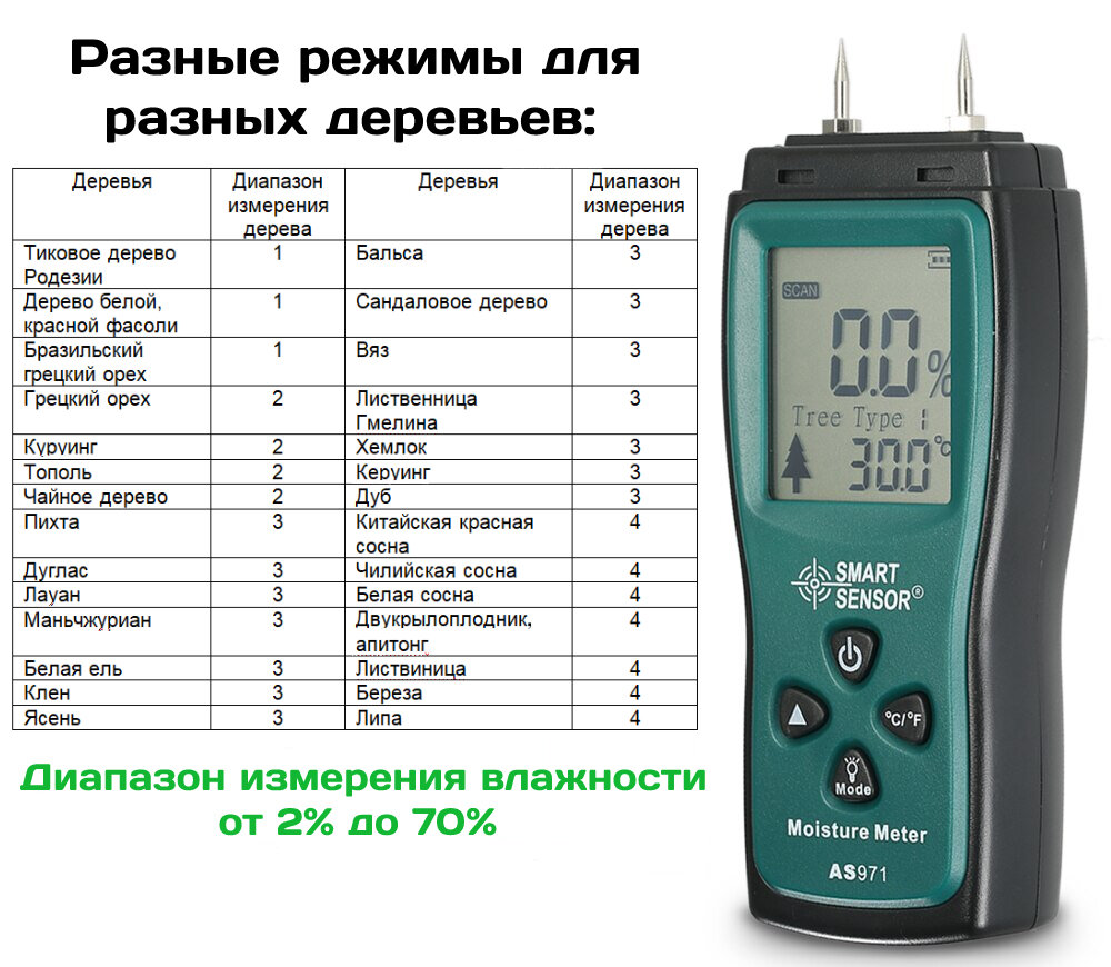 Цифровой измеритель влажности древесины Smart Sensor AS971, влагомер (гигрометр, тестер, детектор влажности древесины) интересное: