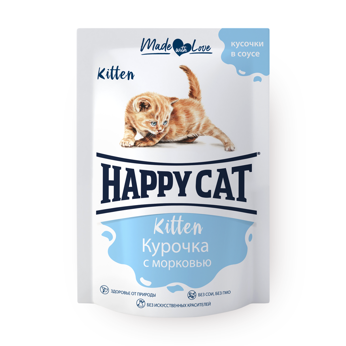 Корм HAPPY CAT 100гр для котят Курочка с морковью в соусе (пауч)