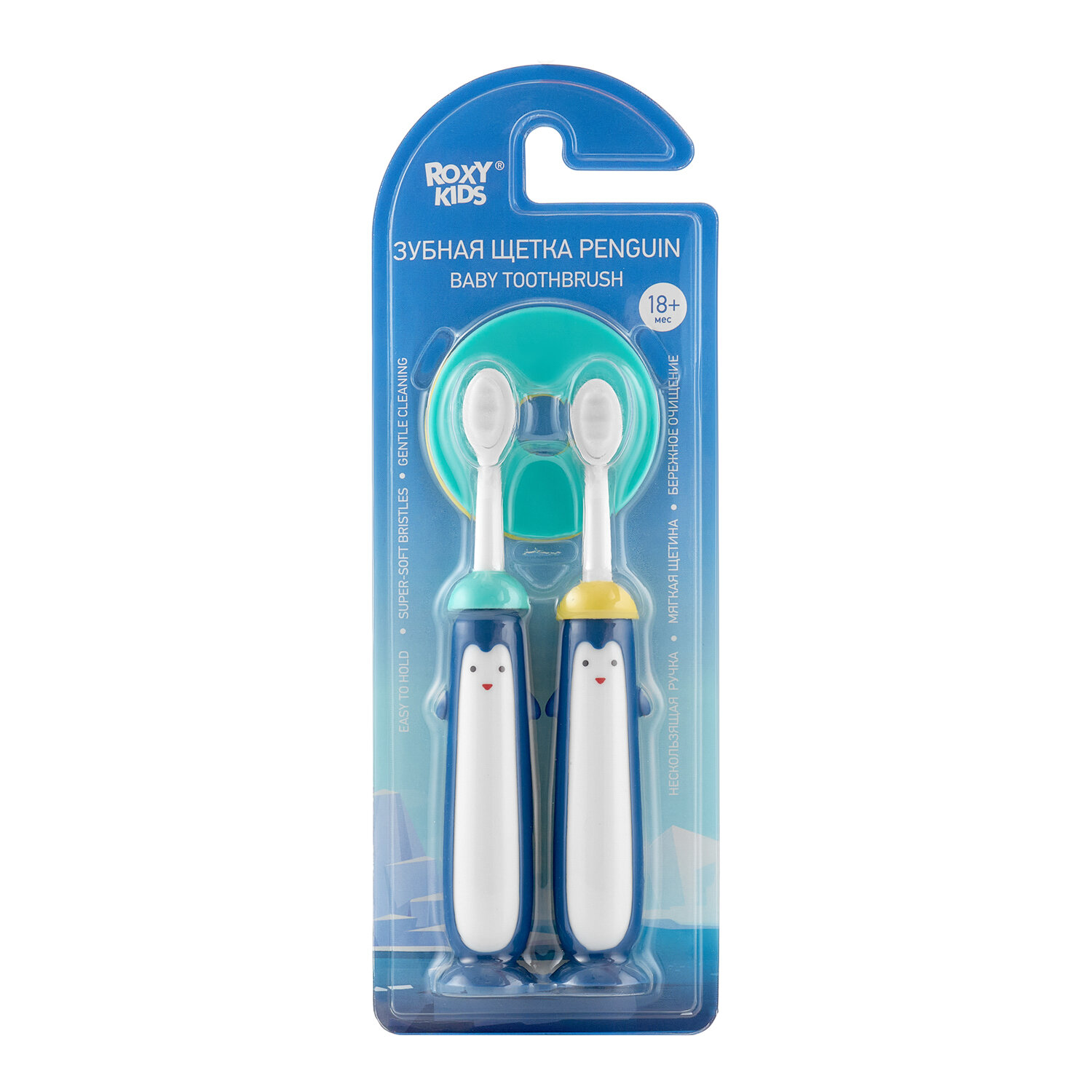 Детские зубные щетки Roxy-Kids Penguin, с ограничителем, для малышей, голубой и желтый, 2 шт.