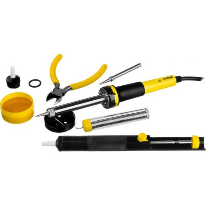 Купить STAYER PROTerm 60Вт с 2К рукояткой, конус, подставка+припой+сменное жало+оловоотсос+сменная насадка+канифоль+кусачки, Паяльный набор (55314-60-H8)
