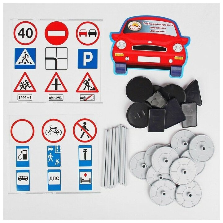 | Плюсы: | Качественные знаки с хорошими липкими наклейками, удобным размером и основанием знаков и светофора с разборной подставкой из пластика. |