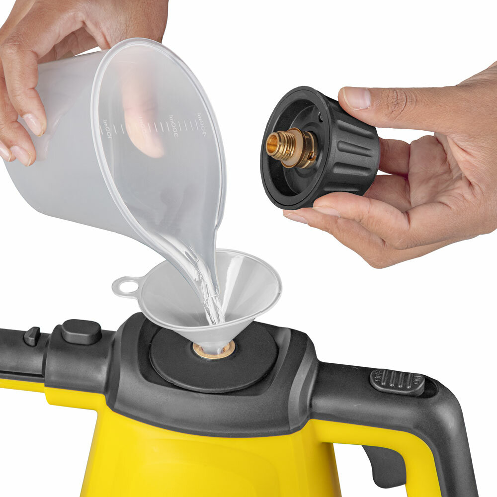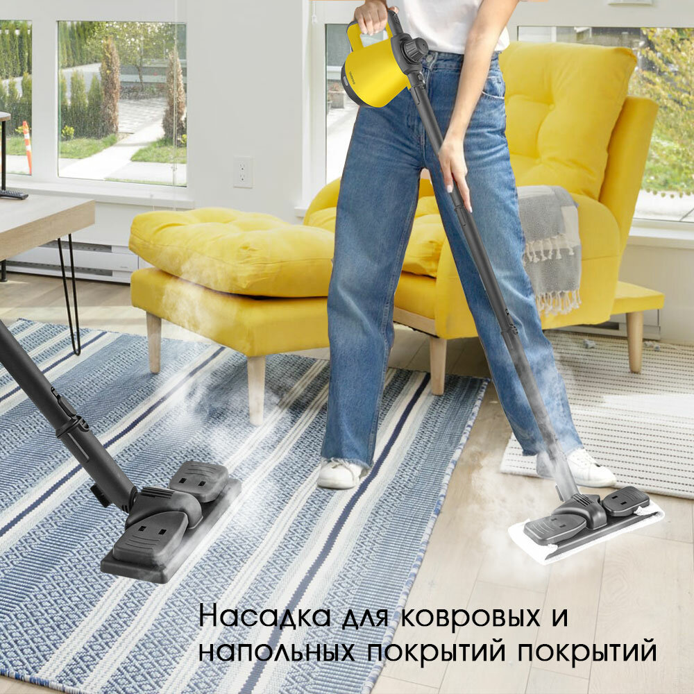 Комплектация - Пароочиститель, Гибкий удлинительный шланг, Насадка-распылитель для пола, Переходник для насадки для пола, Удлинительные трубки, Круглая щетка с полимерной щетиной, Круглая щетка с металлической щетиной, Изогнутая насадка-распылитель, Воронка, Мерный стаканчик, Тканевый чехол для ткани, Тканевая накладка для пола, Насадка для стекол, Руководство по эксплуатации, Гарантийный талон