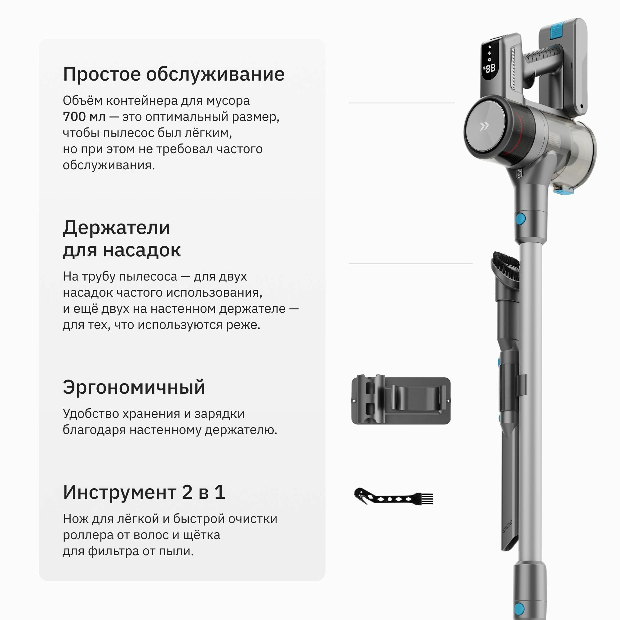 | Плюсы: | Беспроводной. Вертикальная парковка. Подсветка на насадке. Количество насадок. Легко собирается, разбирается. Мусор из пылесборника удаляется без проблем, нажатием одной кнопки. |