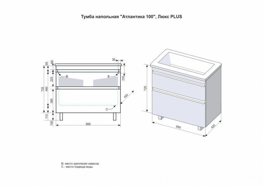 | Дополнительная информация | Оснащение | подвесы;Дополнительная информация | дополнительно крепится к стене;Модель | Атлантика 100;Серия | Атлантика;Вид раковины | накладная (мебельная);Донный клапан | приобретается отдельно;Линии форм основания под раковину | баланс;Линии форм раковины | баланс;Намеченные отверстия под смеситель | нет;Поверхность корпуса | матовая;Поверхность фасада | матовая;Раковина-столешница | нет;Расположение смесителя | посередине;Система хранения | ящики;Слив-перелив | в комплекте;Тумба со столешницей | нет;Форма раковины | прямоугольная;Цвет раковины | белый; |
