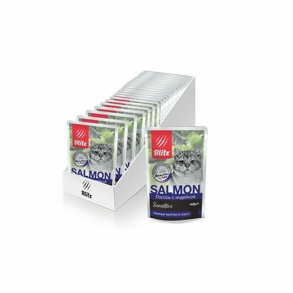 BLITZ SENSITIVE для взрослых кошек с чувствительным пищеварением с лососем и индейкой в соусе (85 гр х 24 шт)