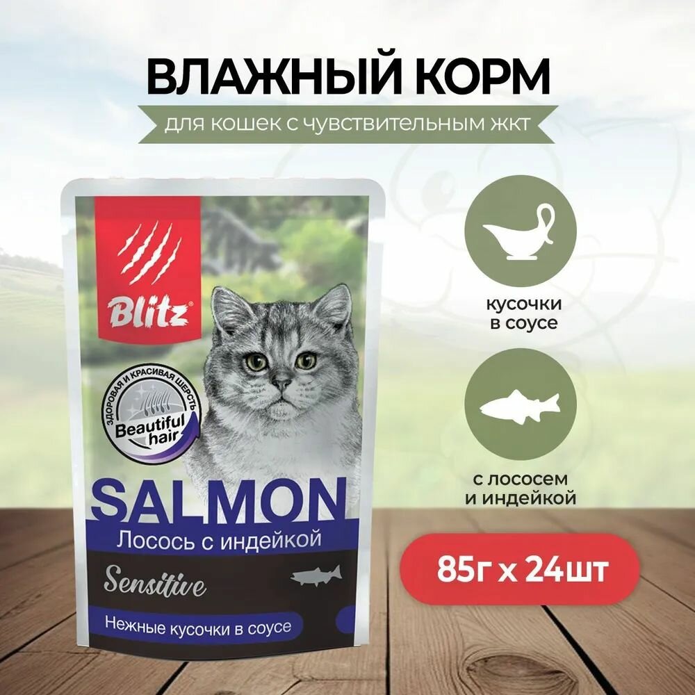 Влажный корм для кошек Blitz Sensitive, при чувствительном пищеварении, с лососем, с индейкой 24 шт. х 85 г (кусочки в соусе)