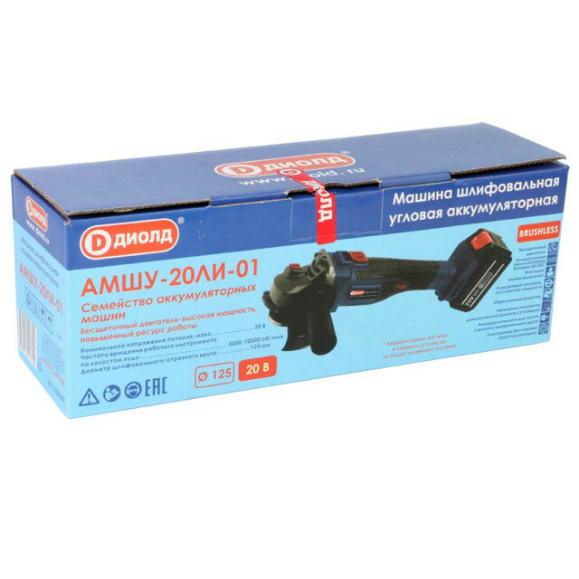 Аккумуляторная шлифмашина диолд АМШУ-20ЛИ-01 / Угловая шлифовальная машина (болгарка) 125 мм, 20 В, 4Ач, 3000-10500об/мин, кейс, производитель Россия