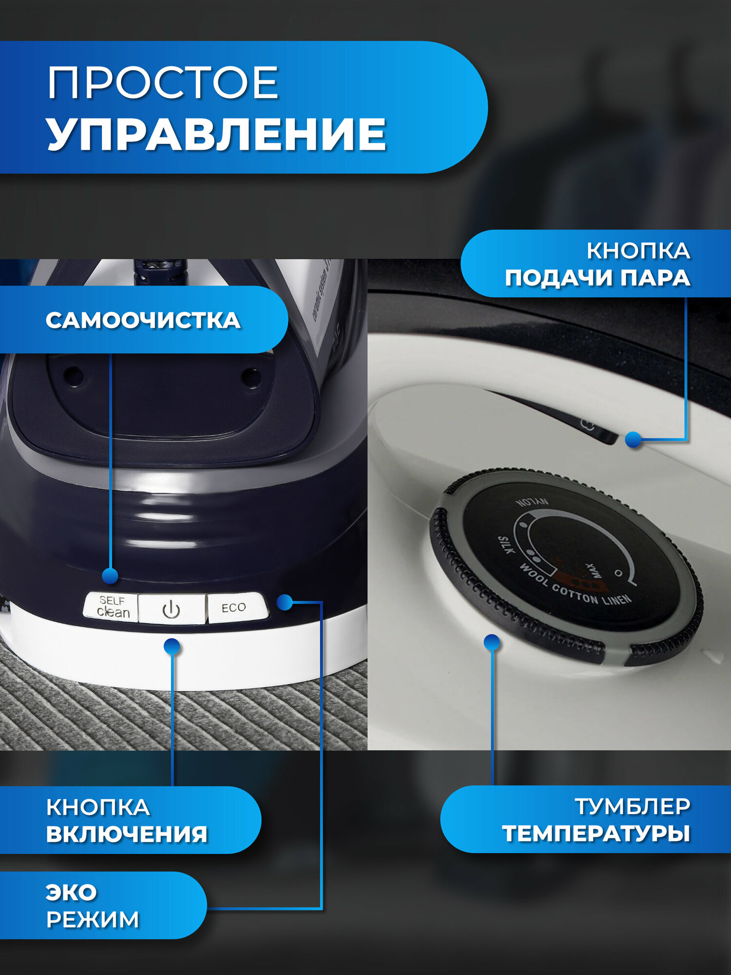 Удобная панель переключения температур,вместительный бак для воды При первом и последующих включениях никаких проблем не было .отличный утюг за свои деньги |