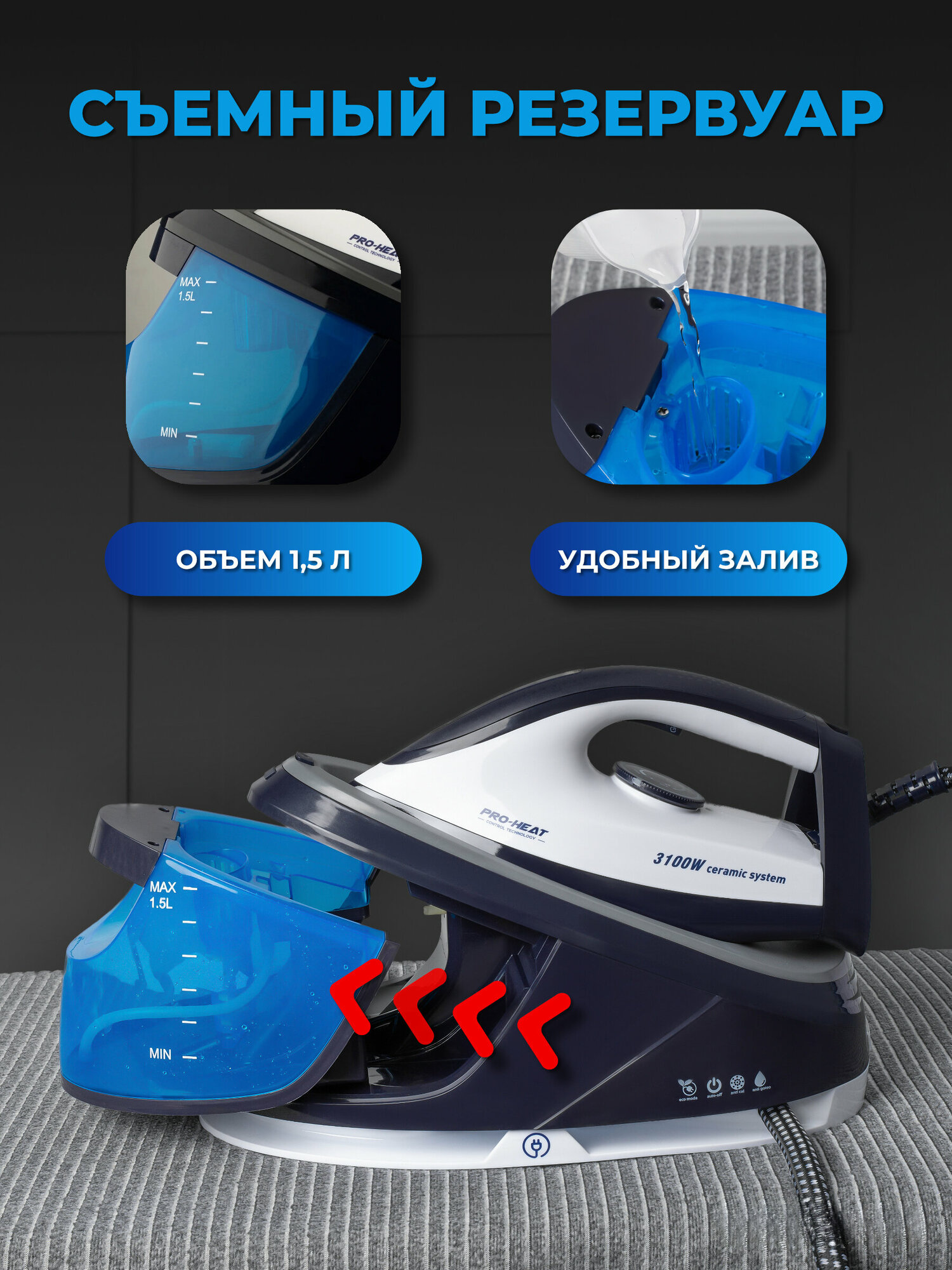 | Особенности | долив воды в процессе работы, съемный резервуар для воды |