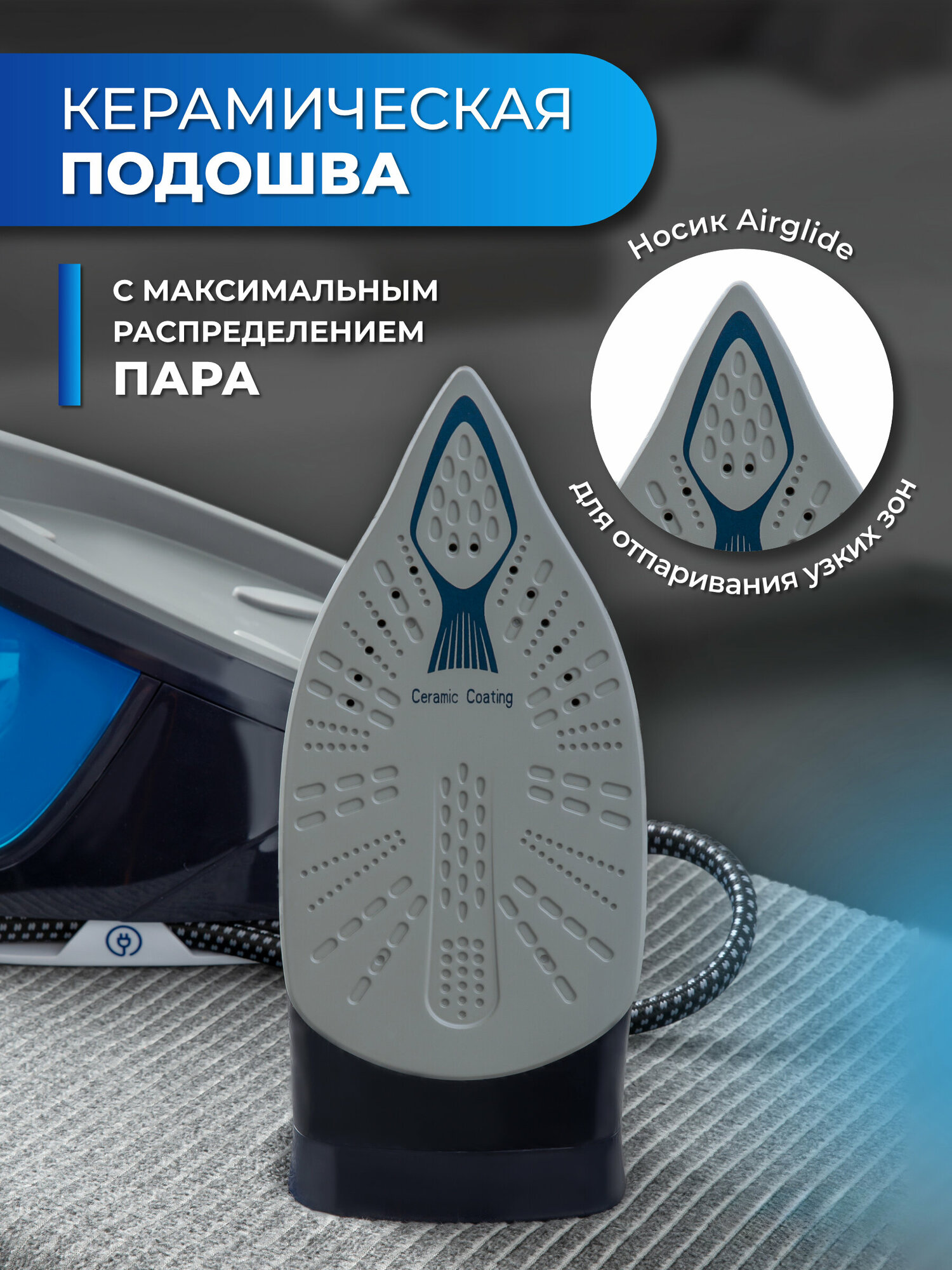 | Плюсы: | Керамическая подошва отлично скользит.мощная подача пара ,благодаря узкому носики проглаживает трудные участки