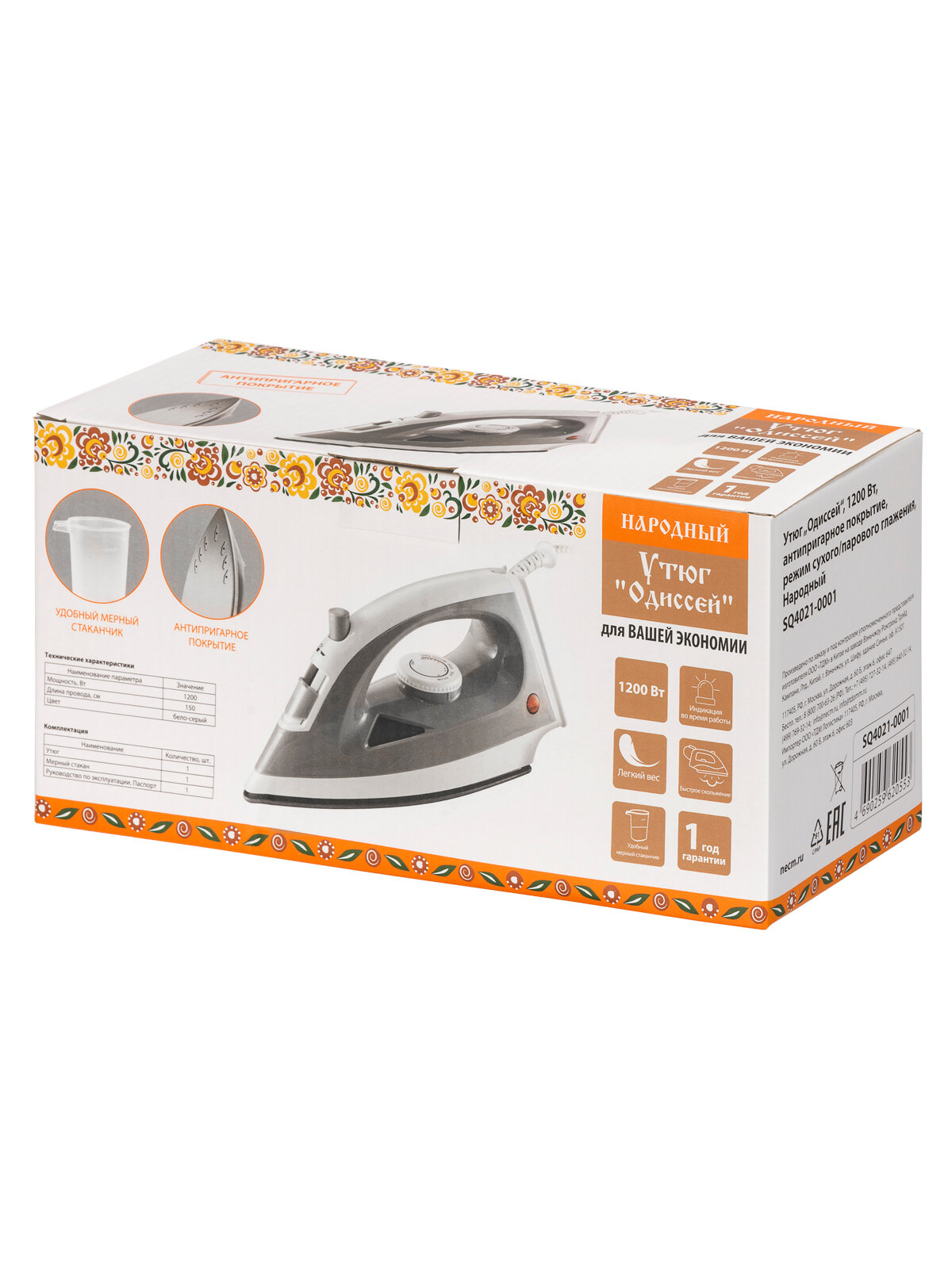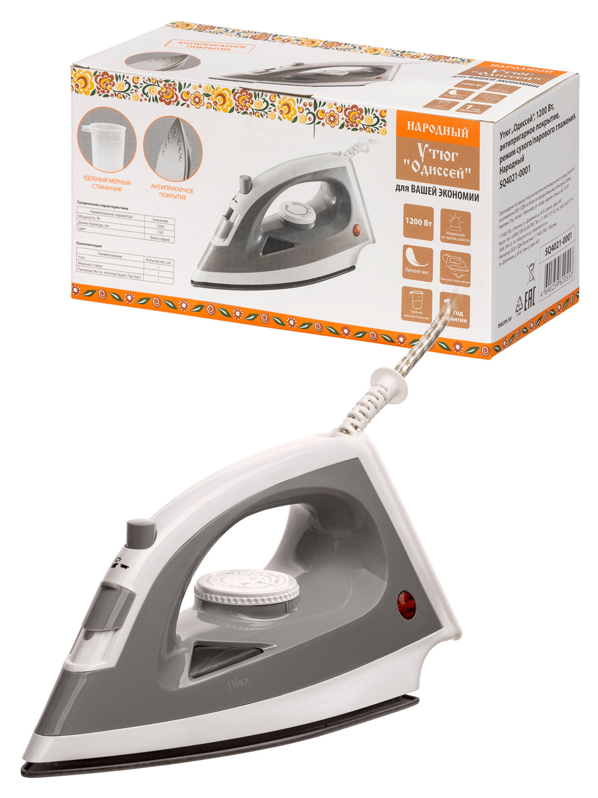 Купить Утюг "Одиссей", 1200 Вт, антипригарное покрытие, режим сухого/парового глажения, Народный