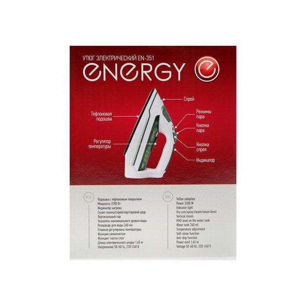 Утюг EN-351, 2200 Вт, тефлоновая подошва, 20 г/мин, 260 мл, бело-зелёный интересное: