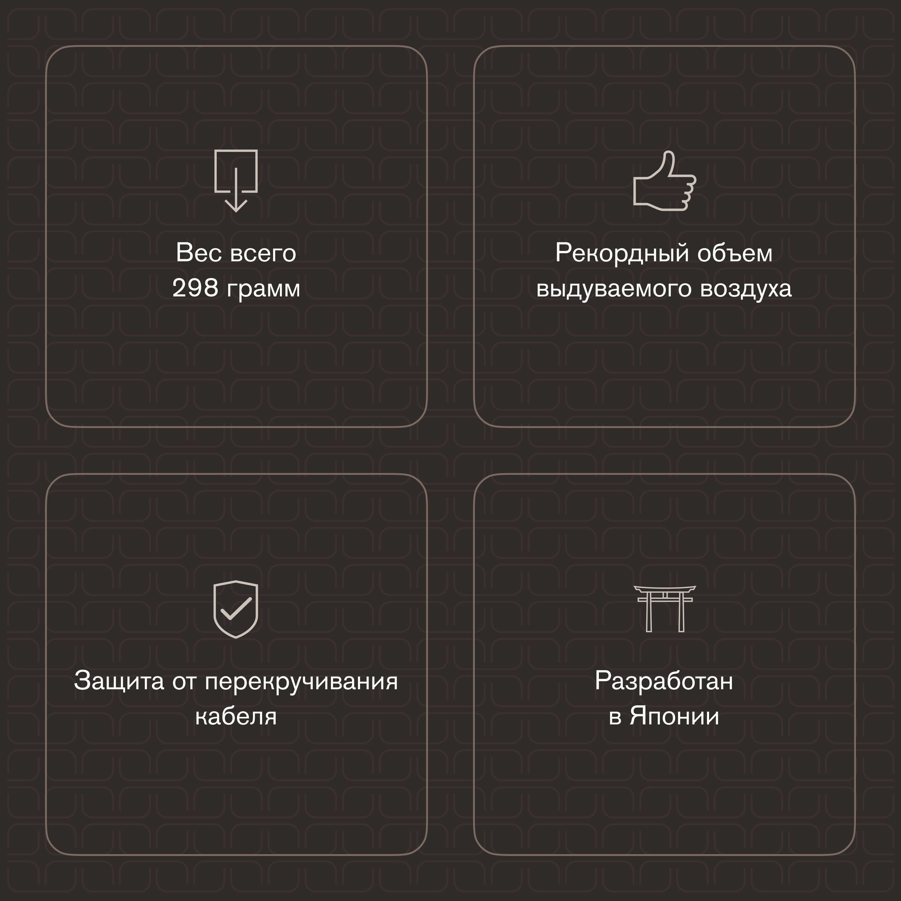 | Плюсы: | Минималистичный дизайн, продуманный чехол, легкий фен. Большая мощность. |