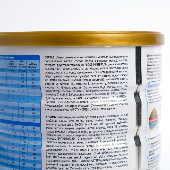 | Состав | обезжиренное молоко, растительные масла (высокоолеиновое подсолнечное масло, соевое масло, кокосовое масло), лактоза, сахароза, фруктоолигосахариды (ФОС), минералы, витамины, олигосахарид 2’-FL, эмульгатор соевый лецитин, докозагексаеновая кислота (DHA) из масла C.cohnii, Bifidobacterium lactis (не менее 10⁶ КОЕ/г), таурин, арахидоновая кислота (АRA) из масла M.alpina, нуклеотиды (цитидин 5’-монофосфат, динатрия уридин 5’-монофосфат, аденозин 5’-монофосфат, динатрия гуанозин 5’-монофосфат), антиокислитель смесь токоферолов, каротиноиды (лютеин, бета-каротин) |