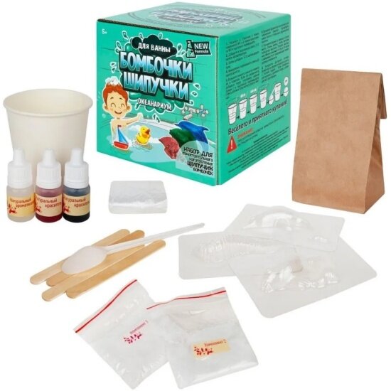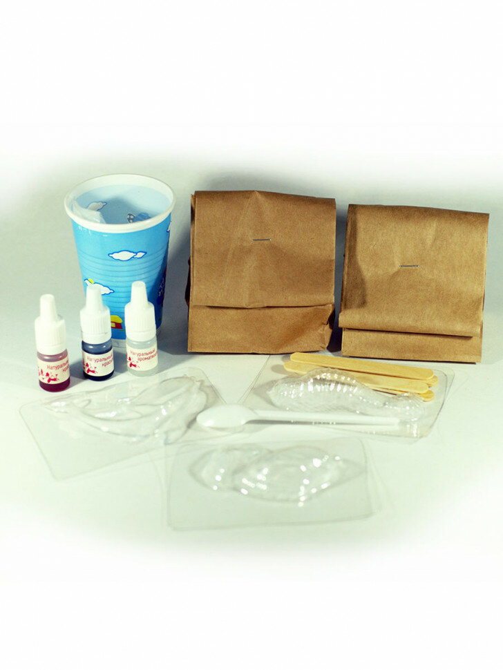 | Состав набора | формочки, емкость для перемешивания, палочки для перемешивания, ложка мерная, перчатки, натуральные компоненты для изготовления бомбочек-шипучек |