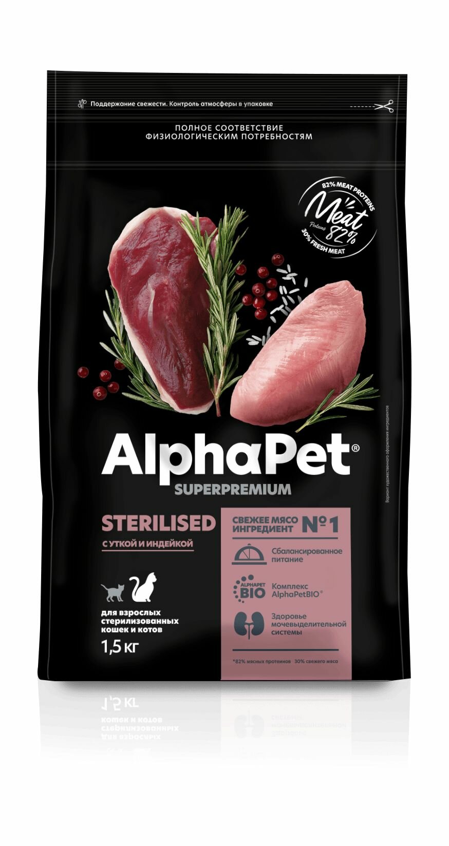 Сухой корм Alphapet Superpremium для взрослых стерилизованных кошек с уткой и индейкой, 1,5 кг