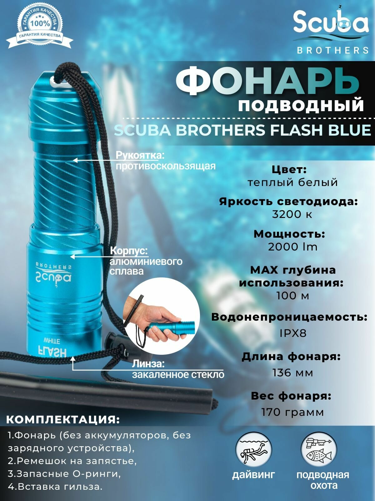Фонарь SCUBA BROTHERS FLASH BLUE 2000Lm CREE XM-L L2, теплый белый свет интересное: