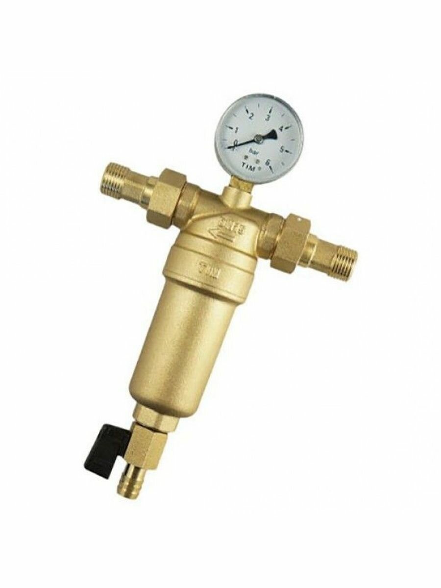 Купить Фильтр механической очистки (самопромывной) TIM 1" НН с манометром американками и сливным краном для горячей воды