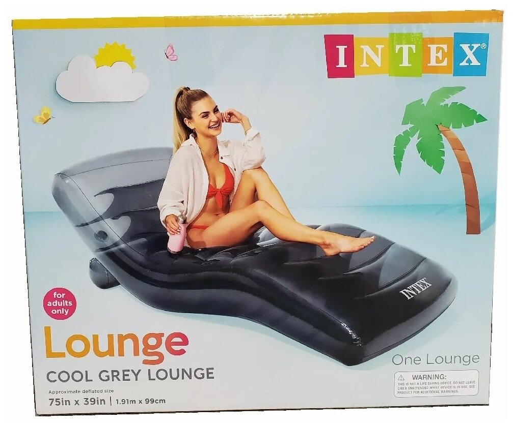 | Комплектация | Надувное кресло 191х99 см, шезлонг пляжный для плавания,цвет дымчато-серый, нагрузка до 100 кг, от 14 лет, без насоса, intex 56875 |