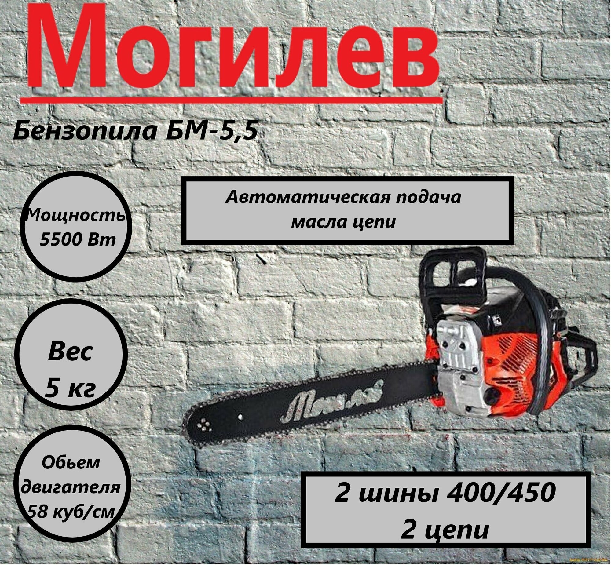 Пила цепная бензиновая Могилев БМ-5,5( 2 шины 450мм/400мм, две цепи), 4.2 л/с, 58СС, 3600об/мин