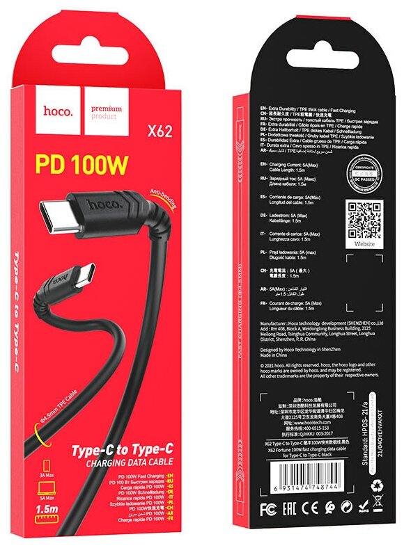 Кабель Type-C на Type-C, HOCO, X62, 100W, черный