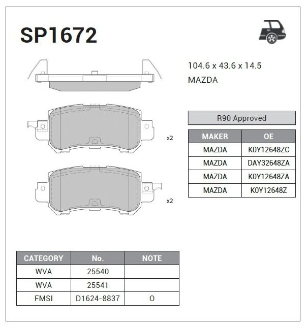 Колодки тормозные задние SP1672 EAN-13: 8809409035543 Ось установки: задняя ось Тип: тормозные колодки