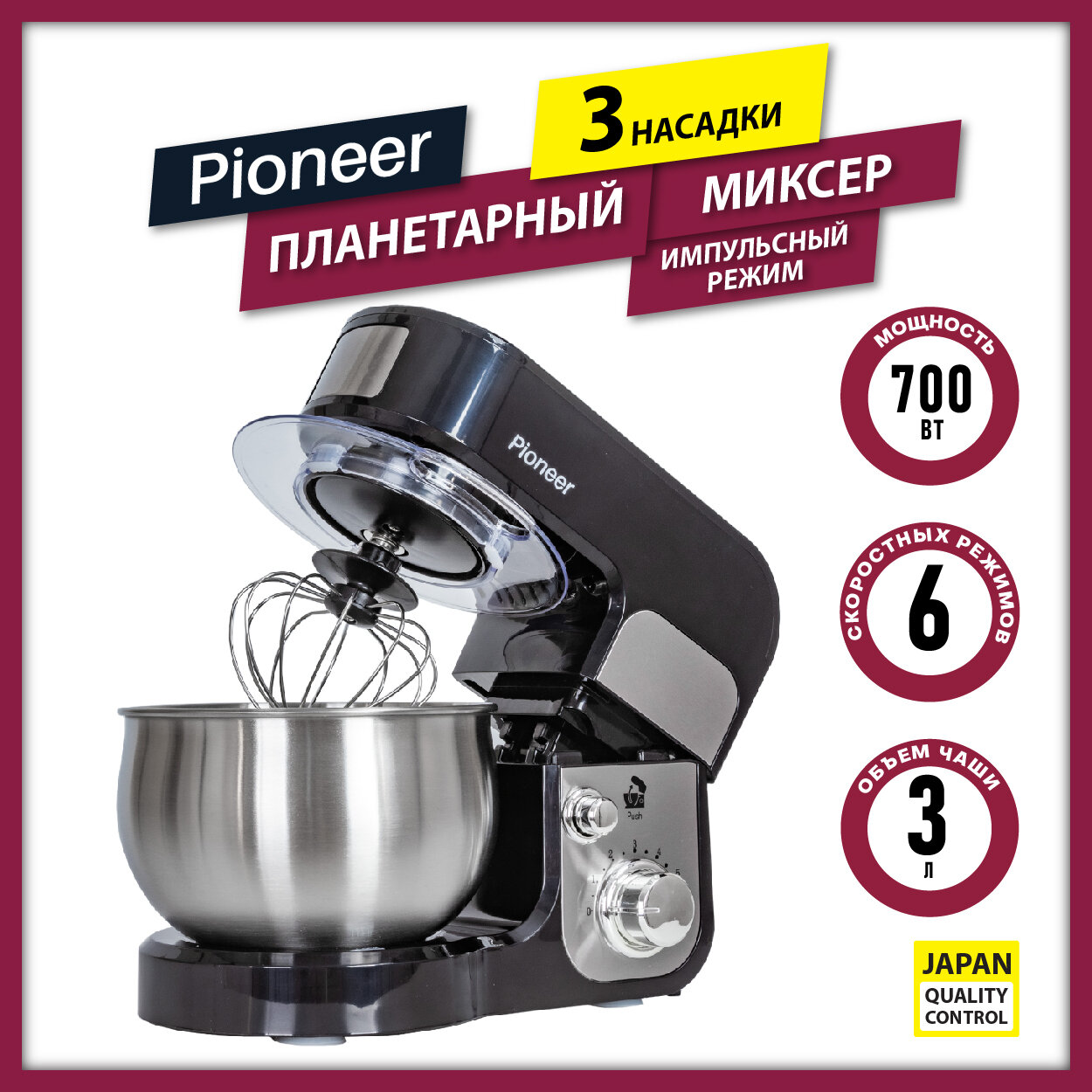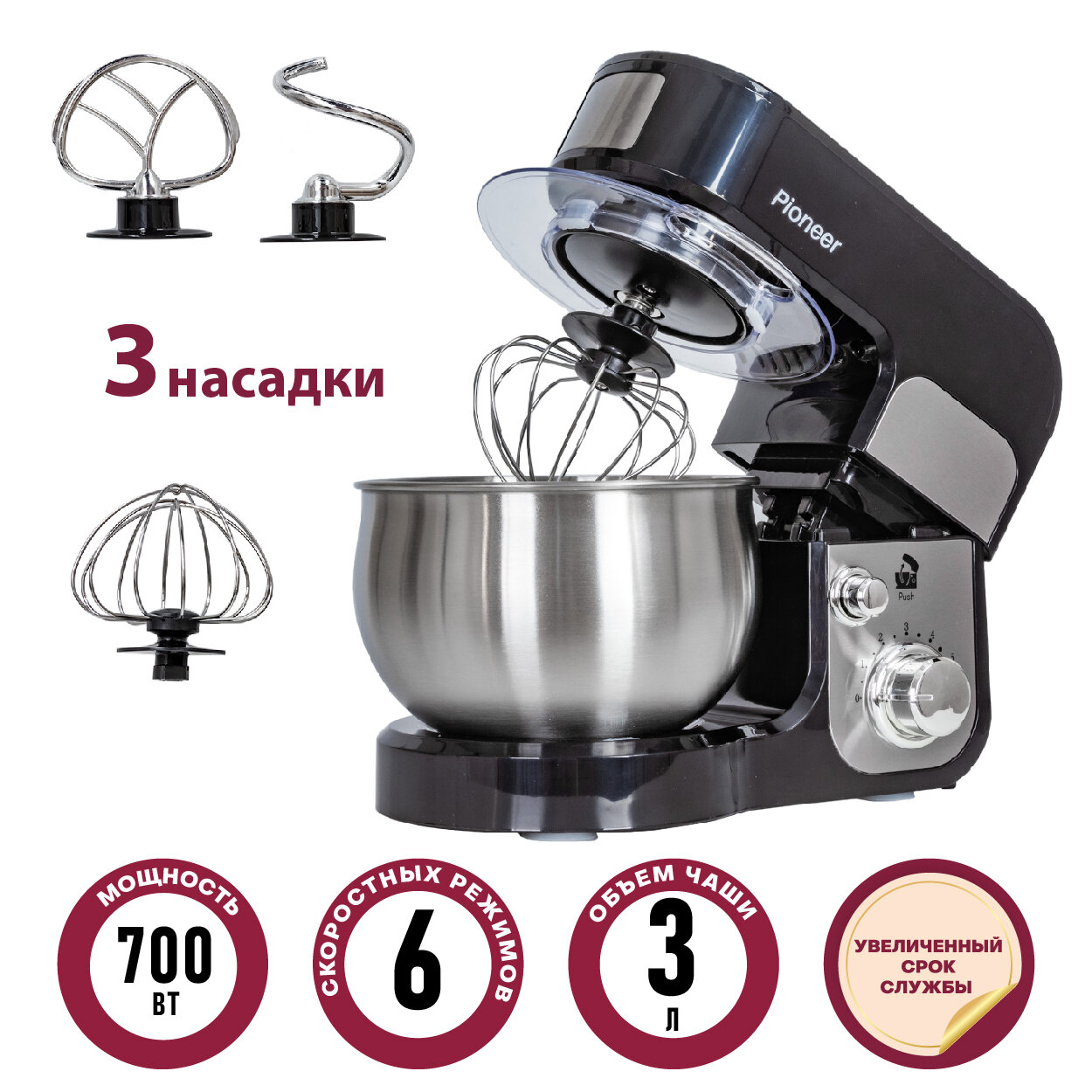 Миксер планетарный Pioneer MX323 black с чашей из нержавеющей стали 3 л, 6 скоростей, 3 насадки, защита двигателя от перегрева, 700 Вт