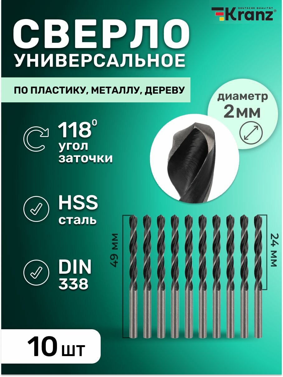 Сверло по металлу Kranz 2х49х24 мм, сталь HSS, DIN 338 (10 шт.)