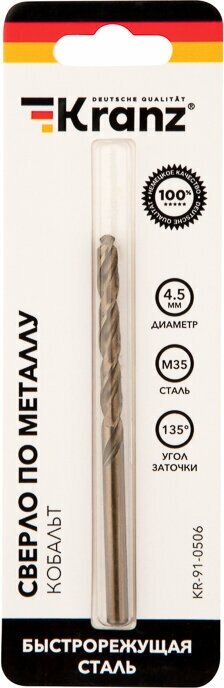 Сверло по металлу 4.5мм «Кобальт» (сталь HSS-Co 5% M35 P6M5K5) DIN 338 (блист.1шт) Kranz KR-91-0506