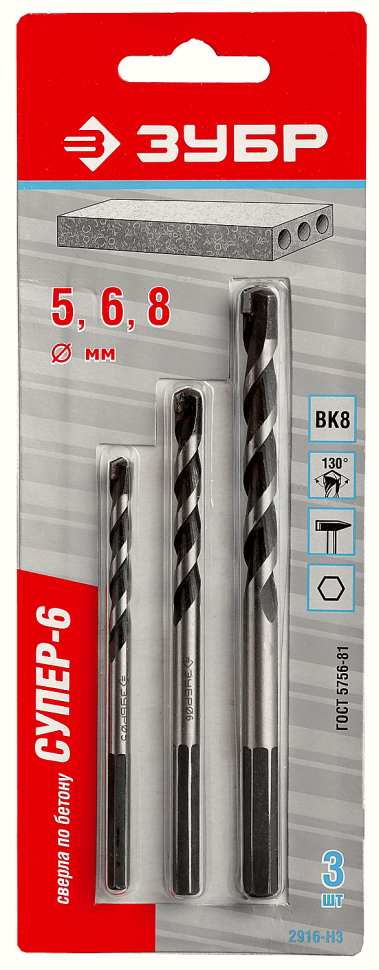 ЗУБР СУПЕР-6 3 шт: d 5-6-8 мм набор сверл по бетону с шестигранным хвостовиком профессионал 2916-H3