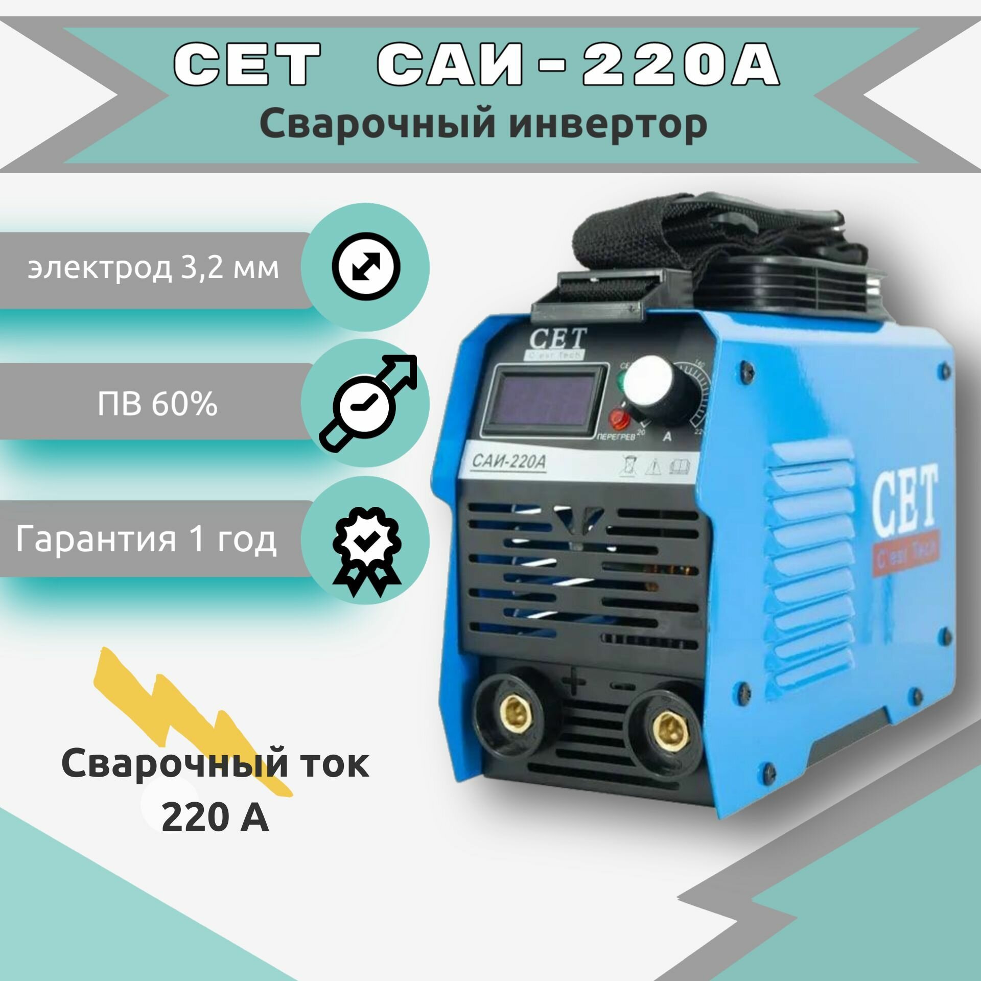 Сварочный аппарат инверторный / сварочный инвертор CET САИ-220A с дисплеем и плечевым ремнем, электрод до 3.2 мм, 60% ПВ