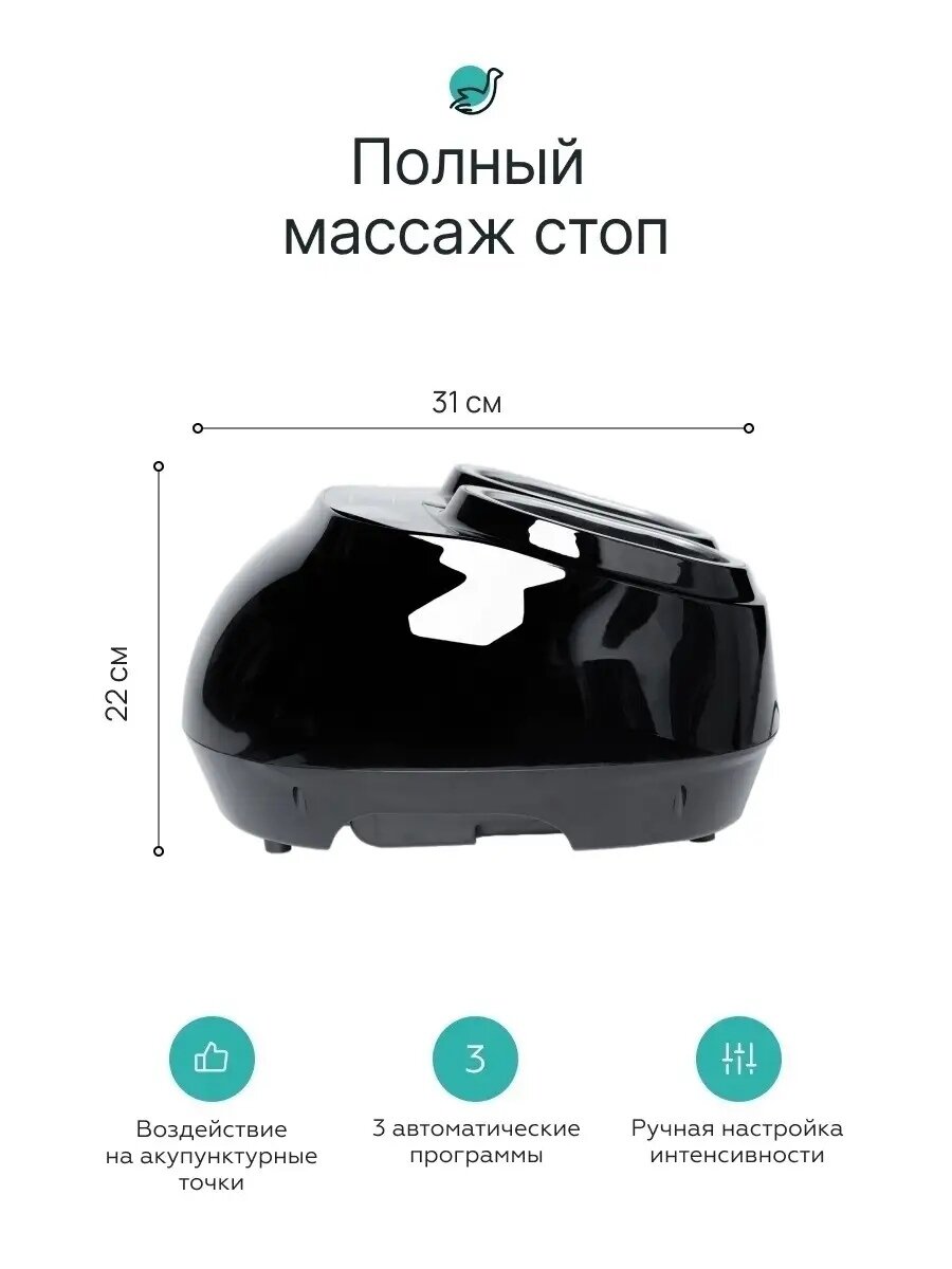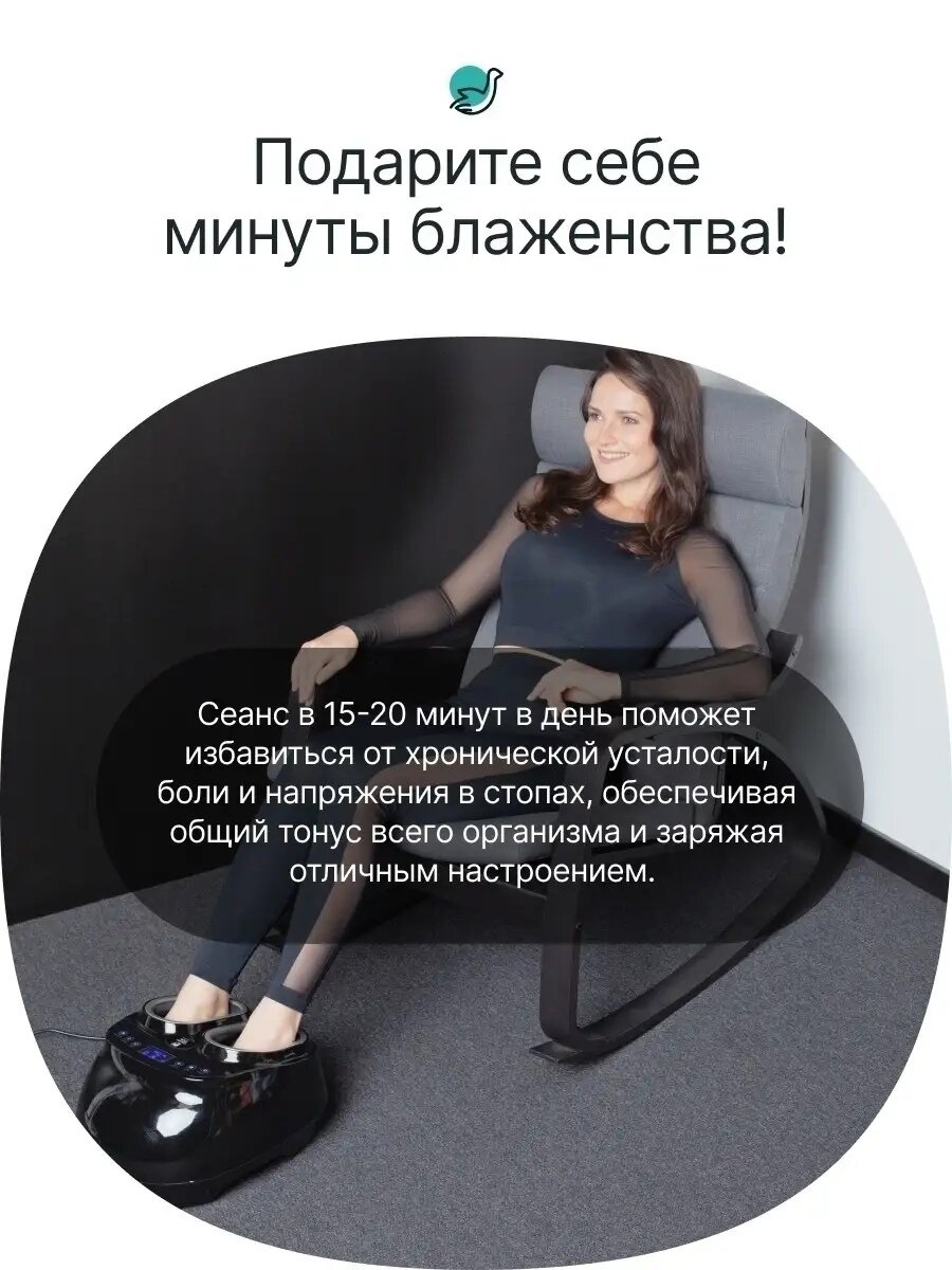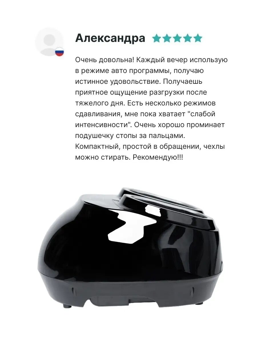 | Отзыв: | Для моего 38 размера массажёр подошёл идеально, вся стопа получает массаж, отличная компрессия. Сам прибор компактный, простой в применении, есть и авторежимы, и ручной, и подогрев. 15 минут массажа стоп после рабочего дня -отличный отдых и релакс перед домашними делами. |