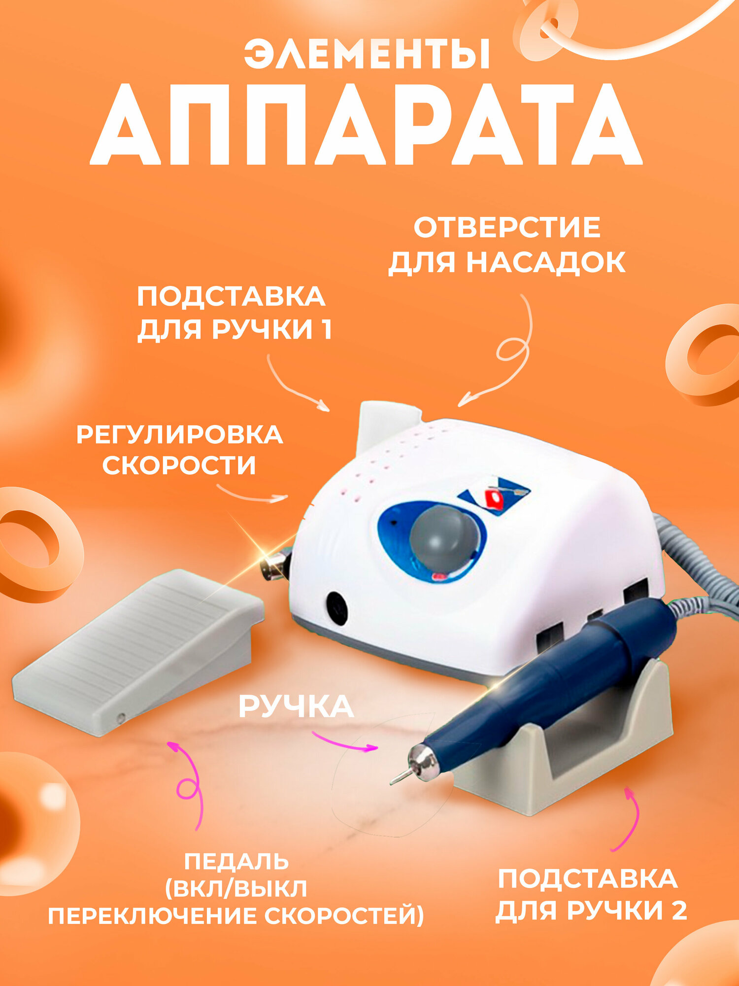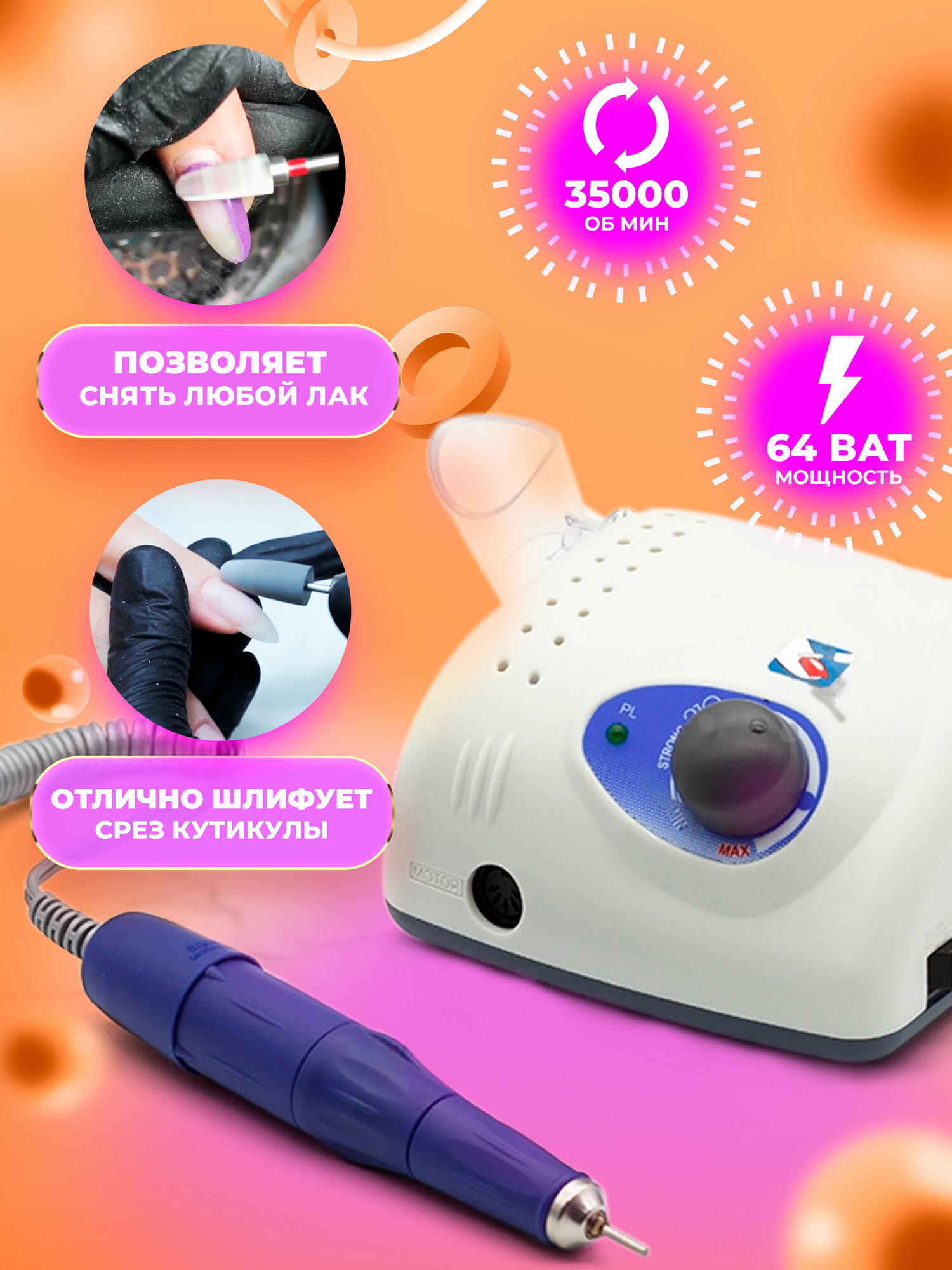 на маникюр хватит, педикюр не тянет ни по оборотами, ни по мощности. греется ручка, запах дешового пластика.. конечно, понимаю, что реплика.. но по качеству он тянет на аппараты в несколько раз дешевле, к сожалению. на карточке товара оборотов 35 т, на том , который пришёл везде наклейка 45т, но по факту раза в 2 точно меньше их. как вывод и работать гораздо дольше. а вот на педикюр вообще не годится. Из-за низких оборотов и маленькой мощности старт диск при соприкосновении со стопой перестаёт вращаться.