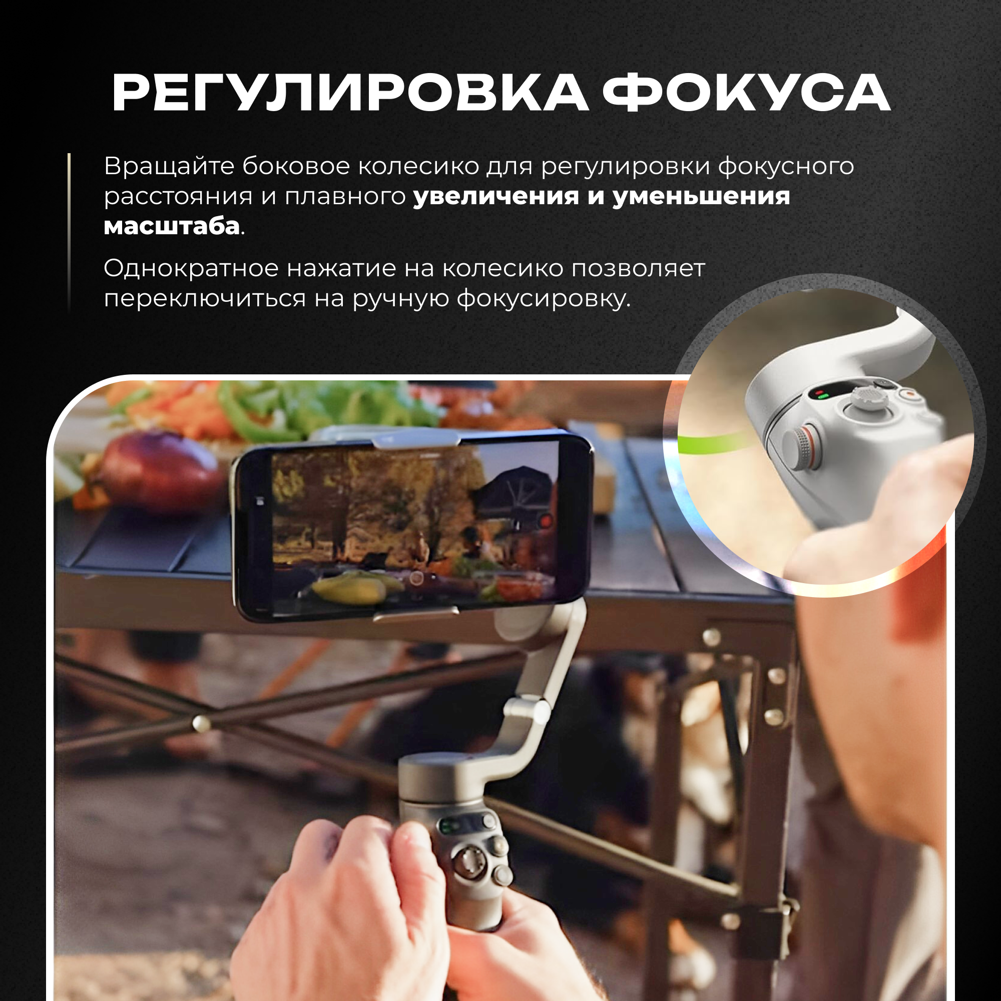 На iPhone есть быстрый запуск приложения сразу после установки телефона на стаб. Много разных режимов съемки, удобное управление, также есть автоматическая калибровка (со штатива) Понравилась возможность быстрой смены ориентации (портрет / ландшафт), для съемки контента под разные площадки. Также выдвигается "сэлфи-палка" В фирменном приложении DJI mimo много разных идей и можно сразу нарезать видео Зарядки хватает на весь день активных съемок Мешочек для хранения в комплекте |