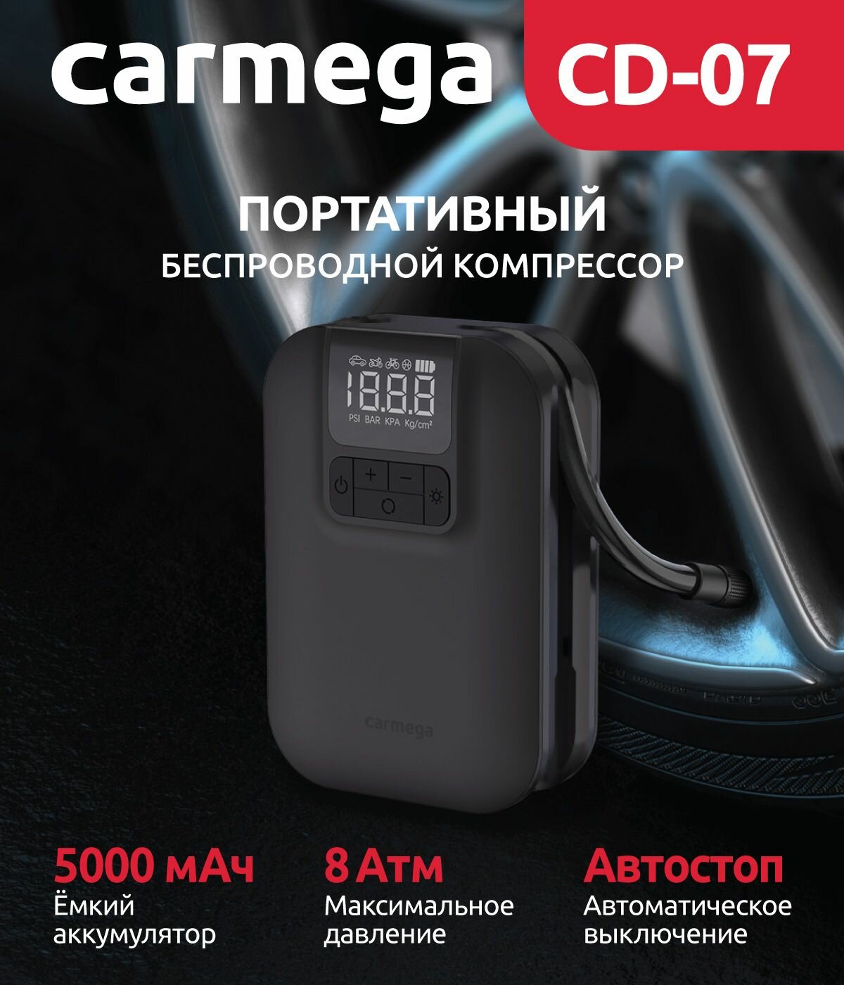 CARMEGA CD07 Компрессор автомобиьный портативный 10атм. 5000мАч фонарь, 3 насадки, чехо CARMEGA