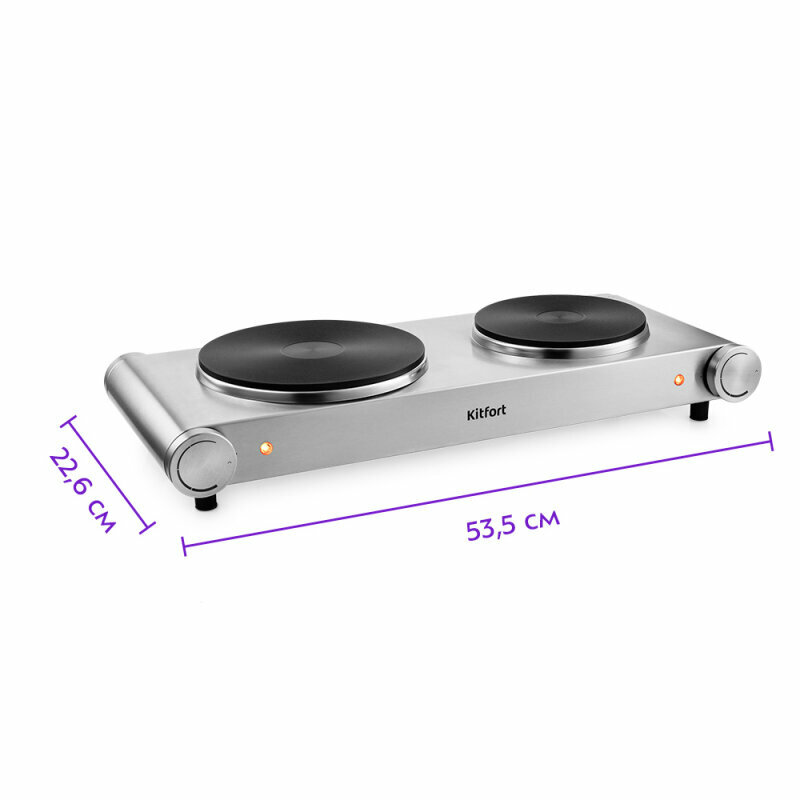 2. Быстрый нагрев чугунных конфорок. 3. Высокие устойчивые ножки, предотвращающие пригорание стола. 4. Приятный дизайн всей конструкции настольной электроплиты. |