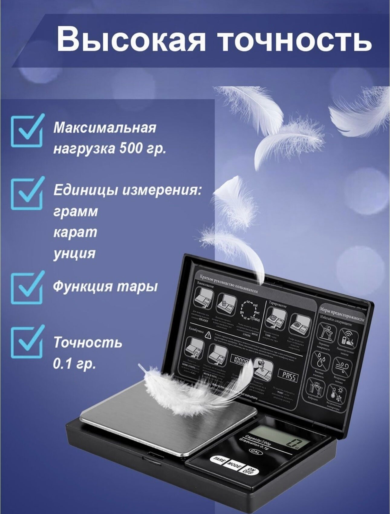 | Минусы: | Хотелось бы чтобы точность была до сотых грамма. |