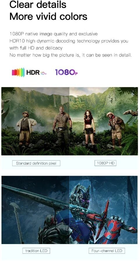 У данного продавца разрешение заявлено 600р. Но другие, что только не пишут и 1080, и 4К. У этого проектора разрешение 720р. Имейте это в виду. Ну про скорость интернета, тоже имейте в виду. Хотя для просмотра ютуба и фильмов онлайн в 720р, скорости по wifi до 30 мбит хватает.