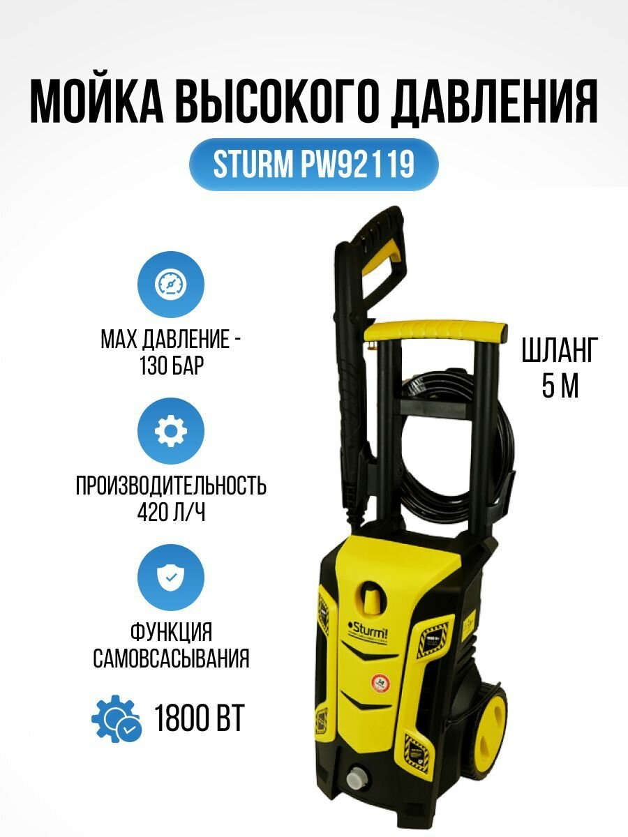 Купить Мойка высокого давления Sturm PW92119 с пеногенератором (130 бар, 420 л/ч, 1800 Вт, 5,3 кг) для мытья авто, для дачи и сада
