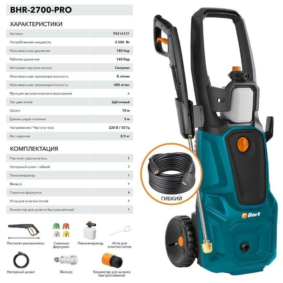 Минимойка BORT BHR-2700-Pro, мощность 2,5 кВт, давление 180 бар, шланг 10 м, 93416121
