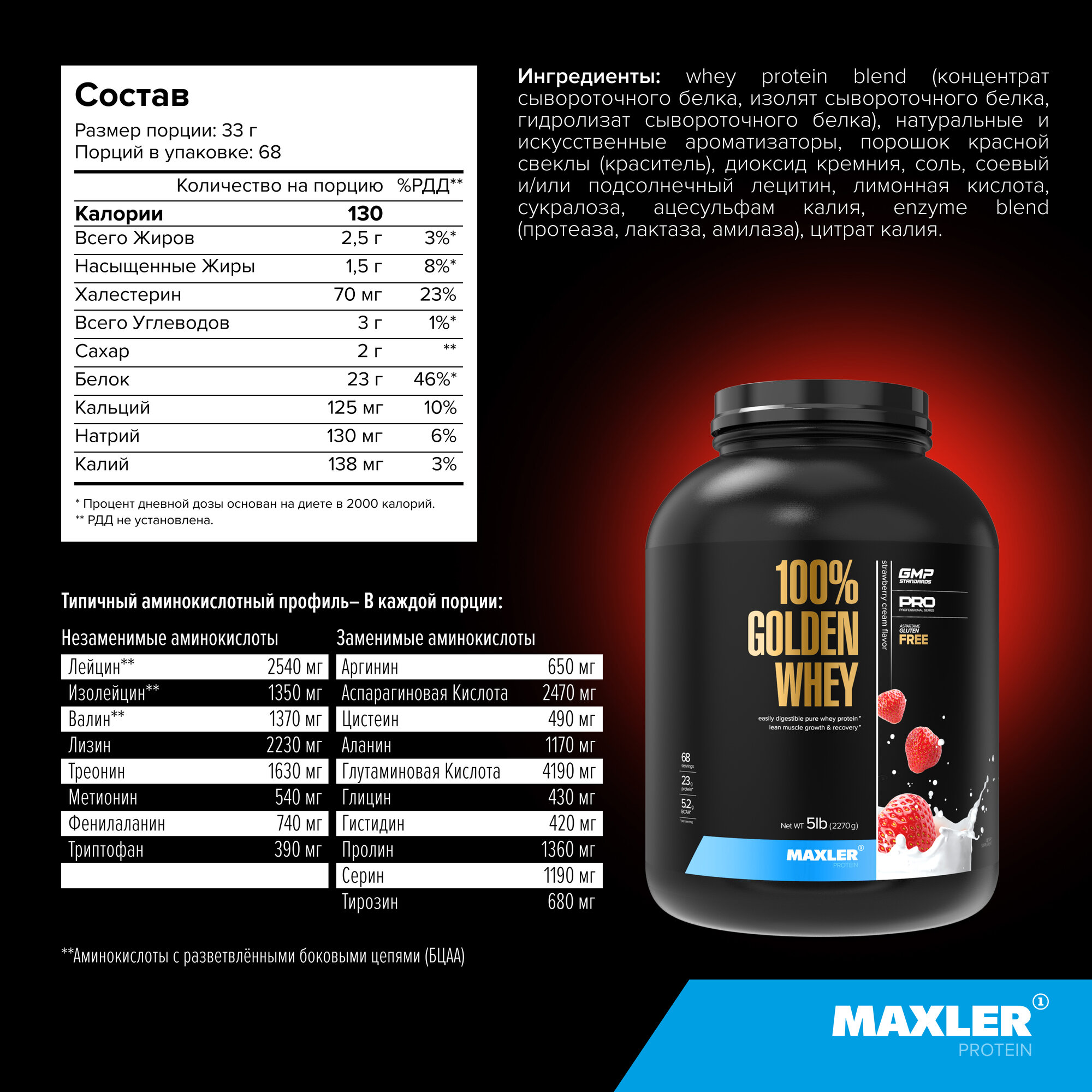 СохранитьСывороточный протеин Maxler 100% Golden Whey со вкусом клубничный крем, 2270г, Рост мышечной массы, Восстановление, BCAA интересное: