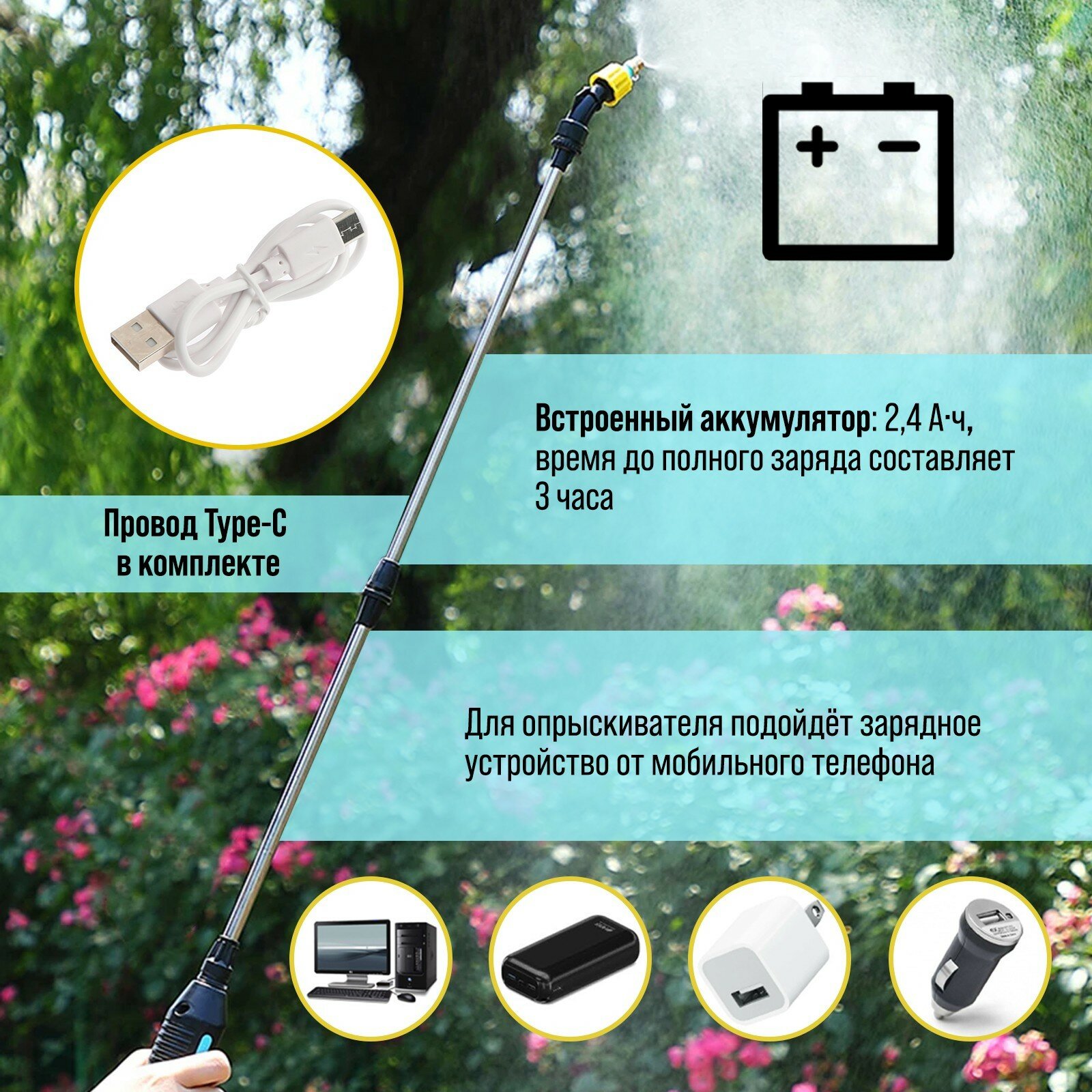 Опрыскиватель аккумуляторный, 4 В, 2.4 Ач, 5 л, 0.8 л/мин, 1 насадка, Type-C интересное: