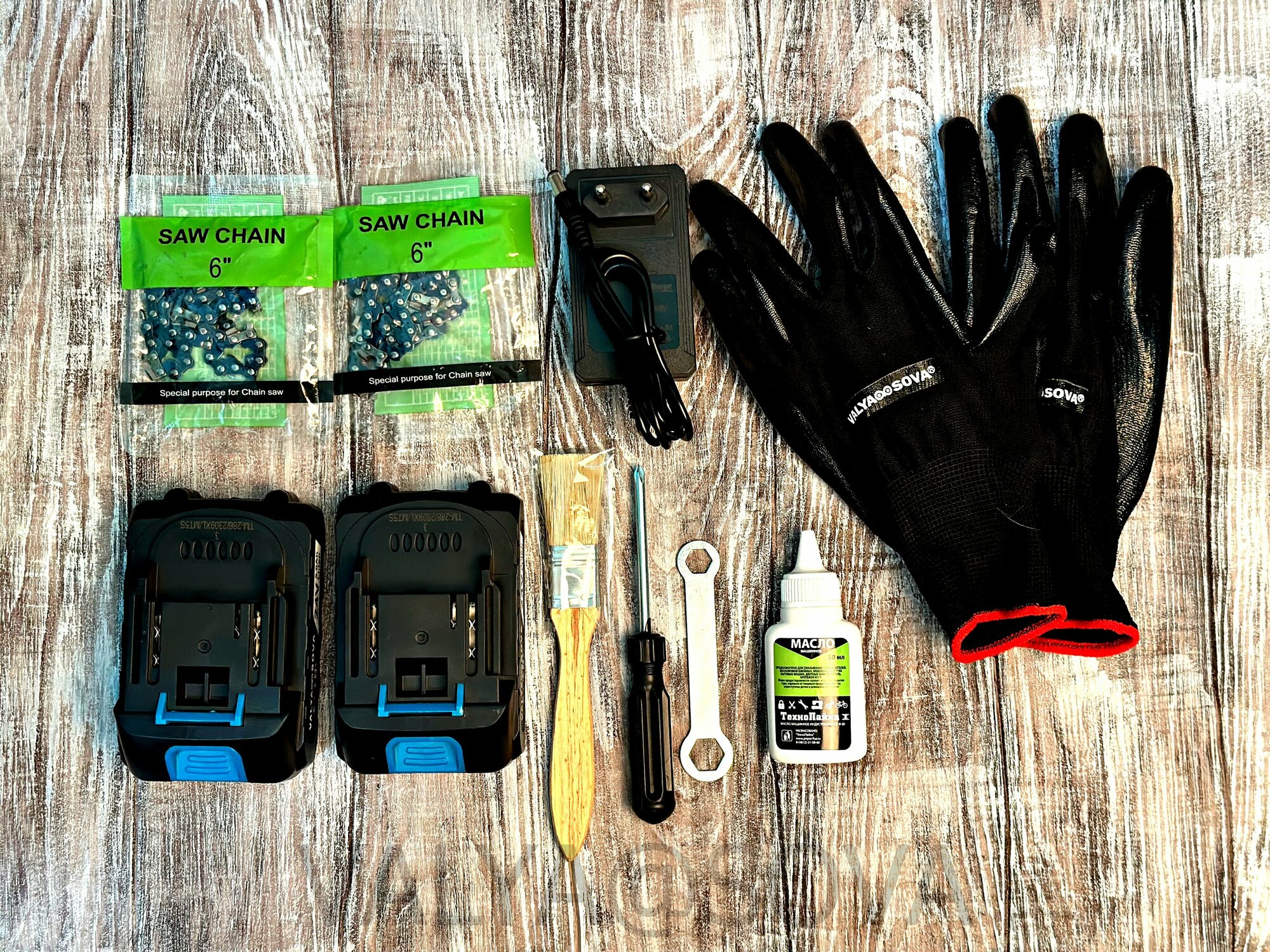 | Комплект поставки | пила, 2 аккумулятора, 2 запасные цепи, зарядное устройство, ключ гаечный, отвертка, перчатки рабочие, масленка с маслом |