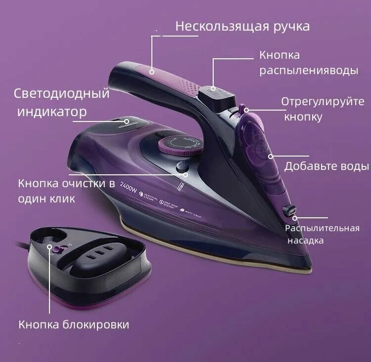 Утюг/Утюг качественный/Беспроводной/Качественный/Мощный 2400Вт/Фиолетовый