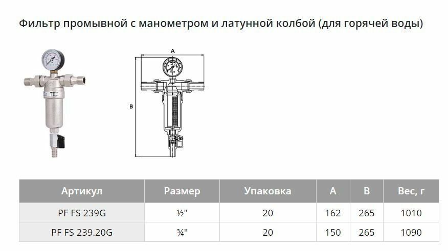 | Дополнительная информация | Фильтр промывной с манометром для холодной воды PF 1/2" (1/20) , PF FS 238G , PROFACTOR |