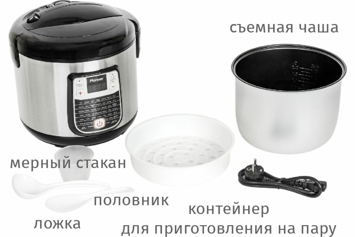 Мультиварка Pioneer с чашей 6 л с антипригарным покрытием 5G, 45 автопрограмм, 200 режимов, таймер 24 часа, "Мой Рецепт", йогурт, суп, плов, 900 Вт интересное: